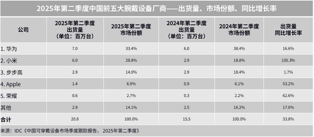 根据国际数据公司IDC最新报告显示,2025 年第二季度全球腕戴设备市场出货量达4922万台,华为以990万台出货量、20.2%的市场份额蝉联全球榜首,相当于每5台智能穿戴设备就有1台来自华为,中国市场更是延续六年霸主地位,市占率高达33.4%,“双料冠军”实力凸显。