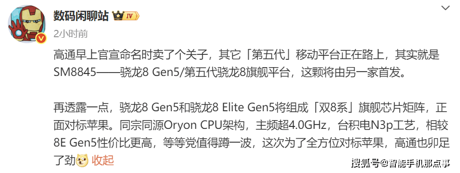 同时有博主爆料指出,高通此次将打破“一代一芯”的传统策略,首次推出双8系旗舰芯片矩阵:骁龙8 Elite Gen5和骁龙8 Gen5(型号SM8845)。